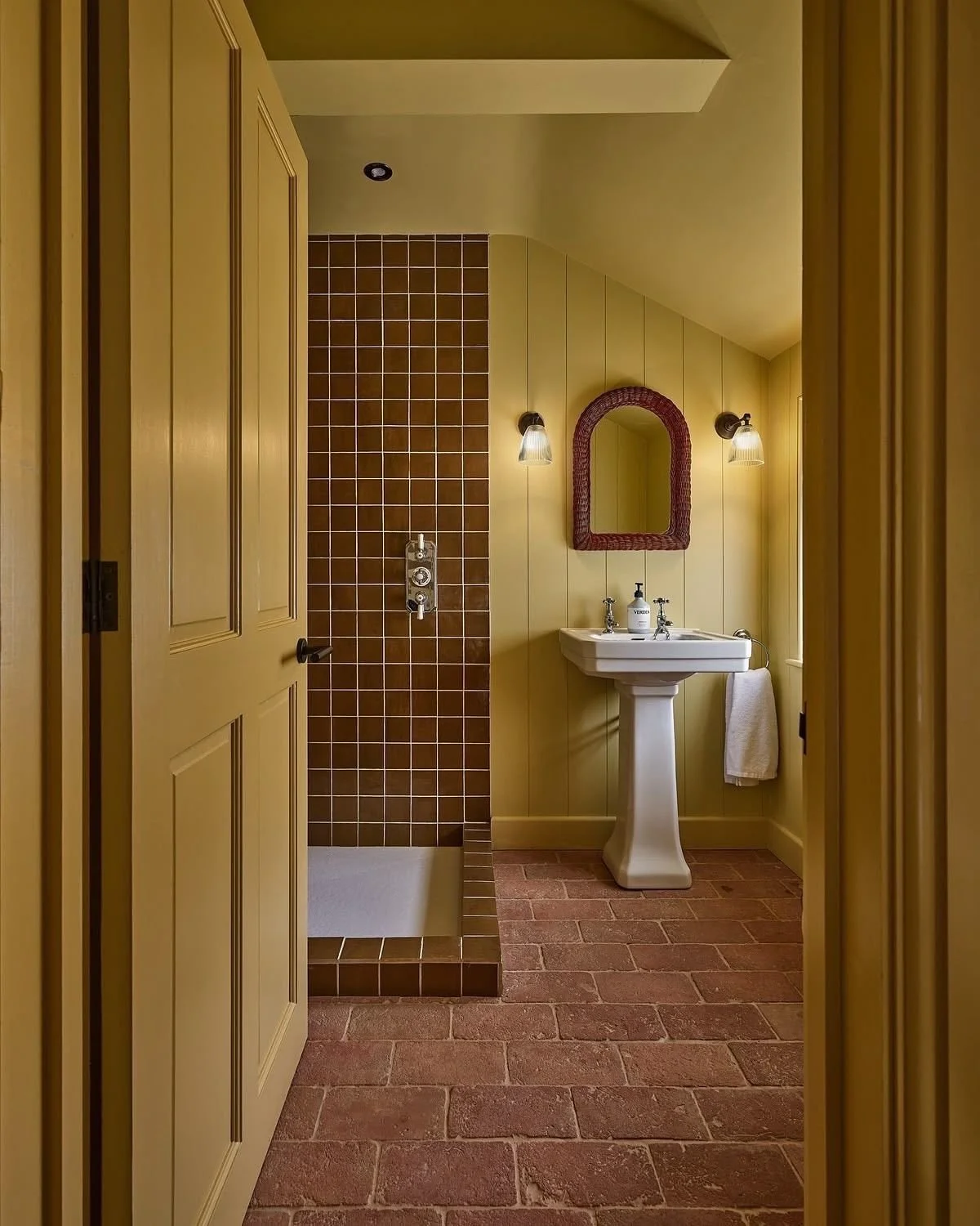 This is where the materials I’m naturally drawn to come in: matte, natural, imperfect. Lime-based paints and earth-inspired pigments add depth to the walls. Then come the layers: unglazed clay tile, honed stone, aged wood, unlacquered metals. These materials absorb light instead of bouncing it, which gives the color even more dimension. It feels grounded and lived-in from the start. Layer by layer — walls, textiles, furniture, floors — the atmosphere starts to take shape.