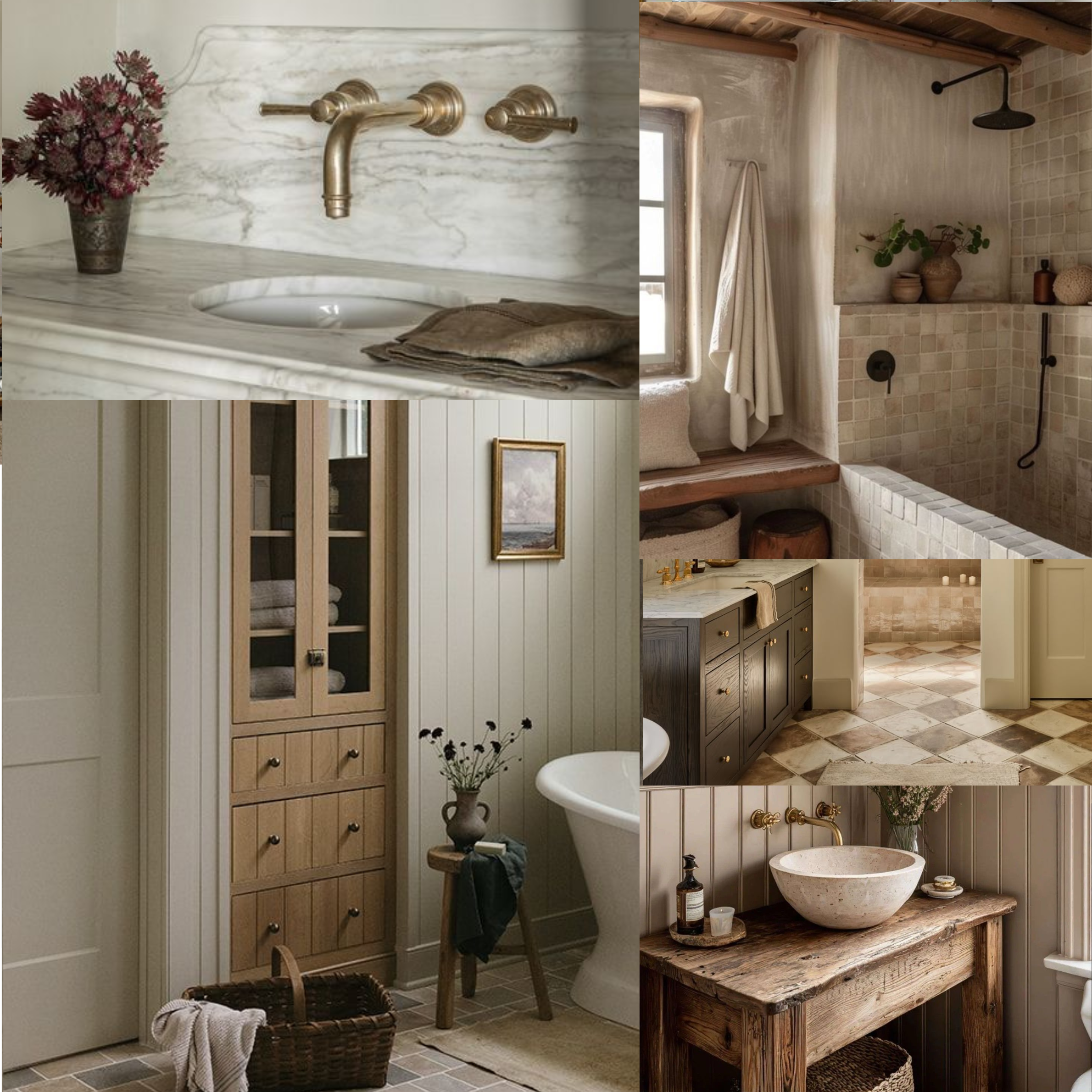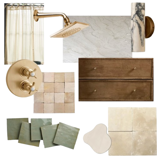 SCIO HILLS. A bathroom remodel rooted in warmth and restraint, layering brass fixtures, handmade tile, and mid-tone woods against soft plastered walls and honed stone. Designed to feel timeless and grounded, the space blends old-world texture with quiet, modern simplicity.