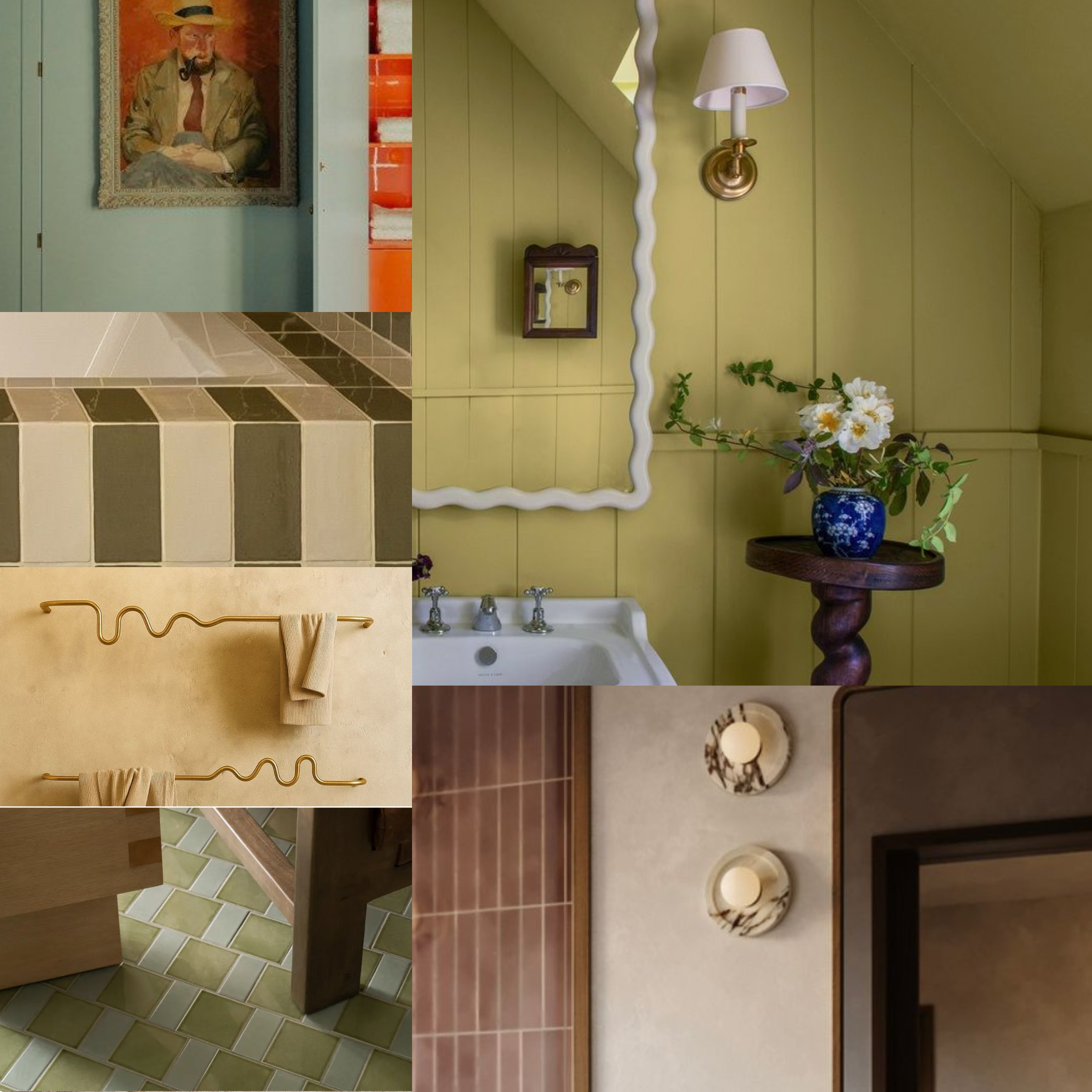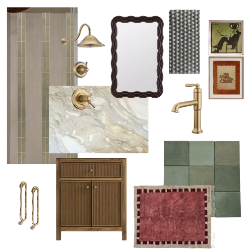 C.M. BATH. A character-forward bathroom layered in saturated color, vintage-inspired detailing, and playful form — where scalloped edges, striped tile, and warm brass create a space that feels collected over time. Bold yet intimate, the design embraces personality while remaining grounded in craftsmanship and material richness. Completed project coming Summer 2026.